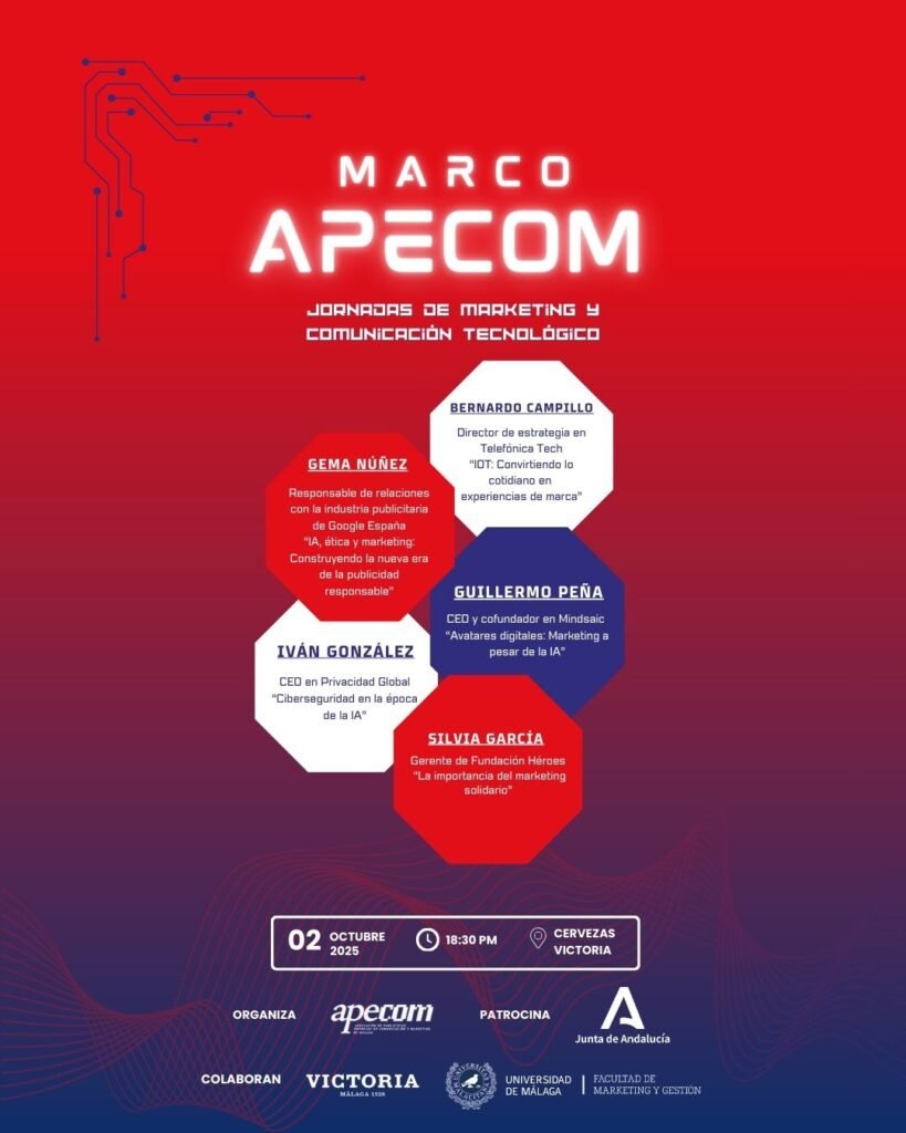 Llega MARCO APECOM: Jornadas de Marketing y Comunicación Tecnológico 🚀 La Fábrica de Cervezas Victoria (Málaga) será el punto de encuentro para profesionales y apasionados del marketing, la comunicación y la innovación digital. 🗓 2 de octubre | 🕡 18:30h Ponentes: Guillermo Peña Cardaño | CEO & co-fundador en Mindsaic → «Avatares digitales: Marketing a […]